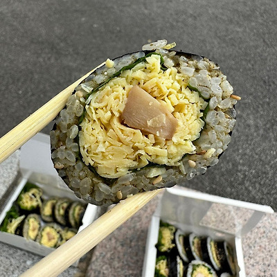 별다른 기교가 없지만 먹자마자 맛깔스러운 고소함이 감도는 김밥.